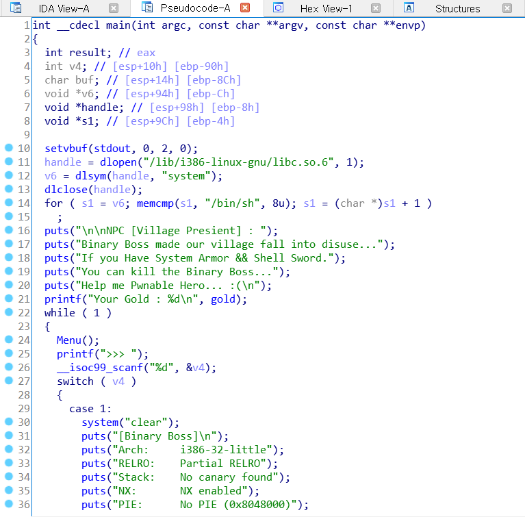 gold가 많아야 case 3, 4, 5를 실행시킬 수 있기 때문에 반복문을 사용해 gold를 모아 주었다. 그 뒤, system 주소와 "/bin/sh" 주소를 찾아 payload를 완성 시켰다.