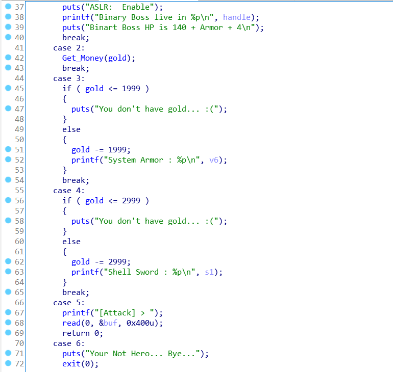 - case 4는 gold를 2999만큼 빼고, shell("/bin/sh")의 주소를 노출(leak)한다.