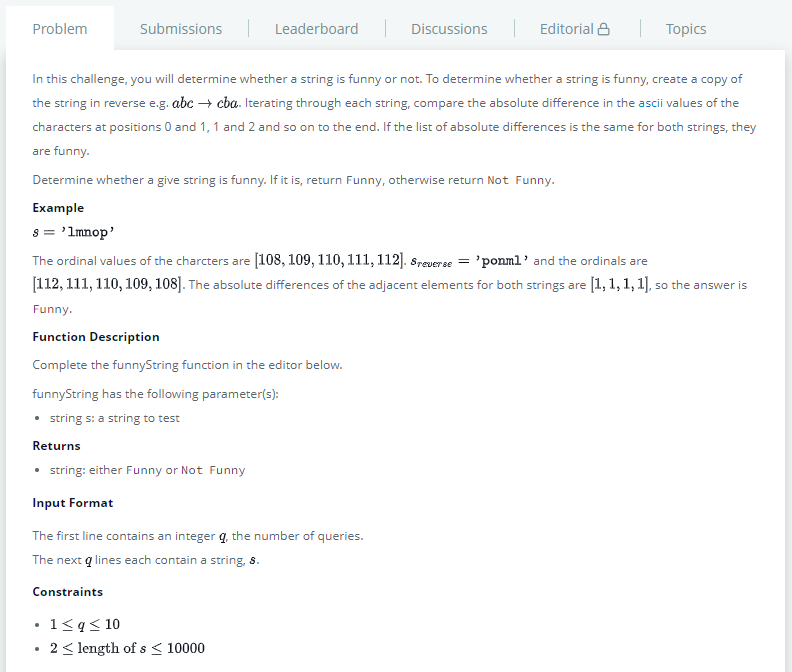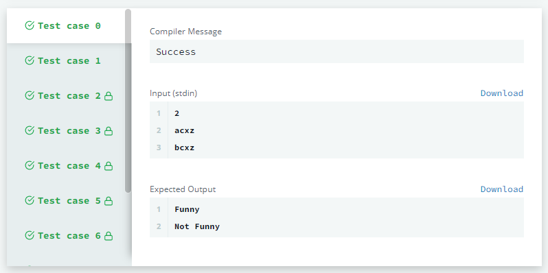- 문제에서 주어진 두 문자 사이의 차가 동일하지 않다면 "Not Funny"를 반환한다.