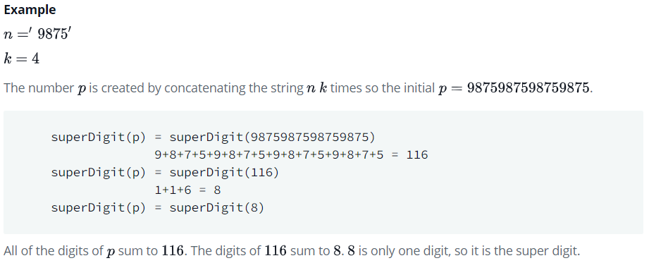 - 처음 함수가 호출될 때와 다르게 k의 값이 필요하지 않으므로 1을 넣어서 superDigit() 함수를 호출한다.