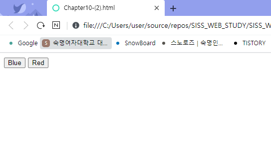 - 자바스크립트를 사용하여 style 속성에 접근하여 배경색을 변경하는 동적 웹문서를 만든다. 두개의 버튼을 만들고 파란색 버튼을 누르면 배경색이 파란색으로 붉은색 버튼을 누르면 배경색이 붉은색으로 변경되는 웹 문서를 작성한다.